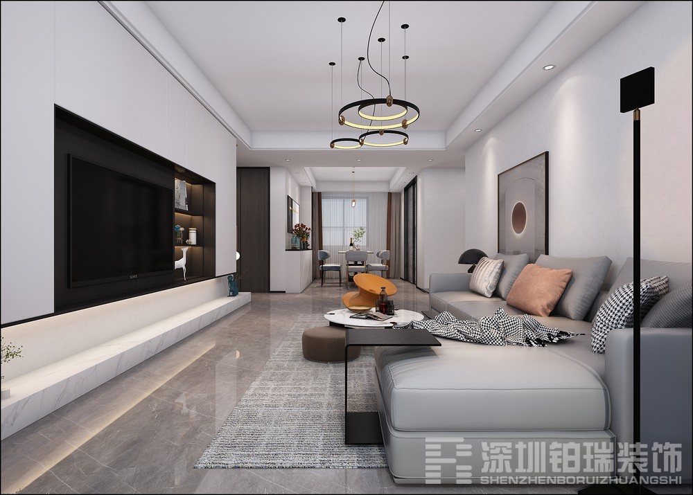 设计说明:本案利用“自在的精神归属”这一概念,传达出历经繁华,回归到平静自然的可贵,用人与空间的关系丰盈屋主的生活日常,在家的精神容器中寻找恒远的意义与依托……电视墙白色柜体,恰到好处的留白,局部用黑色点缀,追求极致的简约,层次感分明。浅色沙发兼顾了美感与舒适性,独特的摆件,为空间增添了趣味性,色彩赋予空间最妥帖的适度表达,黑白灰的调配组合,于清冷中焕发生机,雅致而盎然。缓缓治愈岁月里的成长桥段。