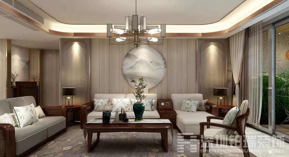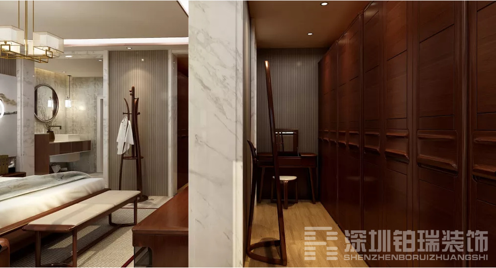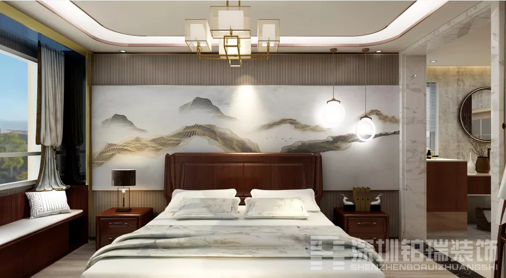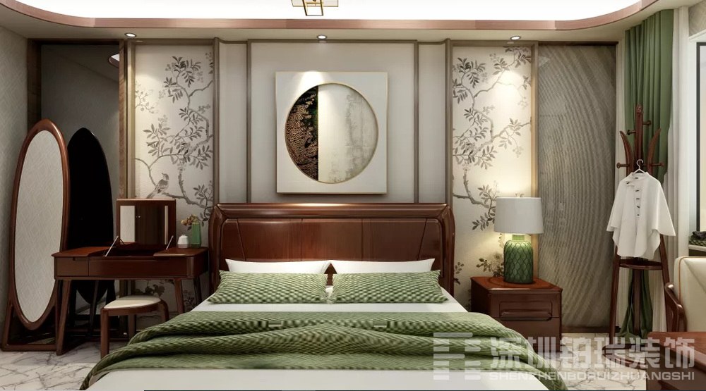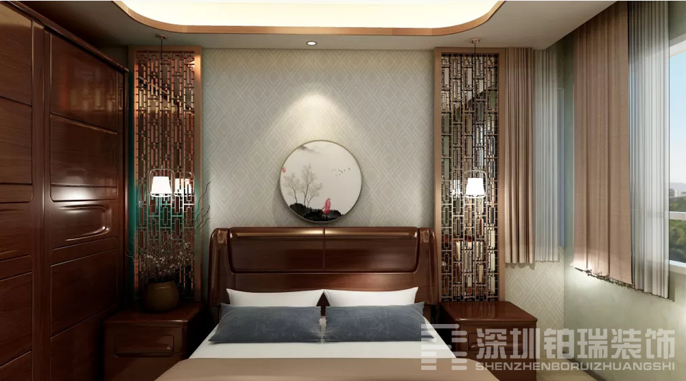 设计说明:“流光千年印古意,四壁浮影悟中彩,袅袅熏香絮絮绕,诗词意境自然来”。新中式风格配色讲究沉稳低调,多以深色为主,而新中式风格在这之中更为简洁大方,大部分以雅致清透的中性色调为基础。像抿一口清茶,沁人心脾,安闲自得。