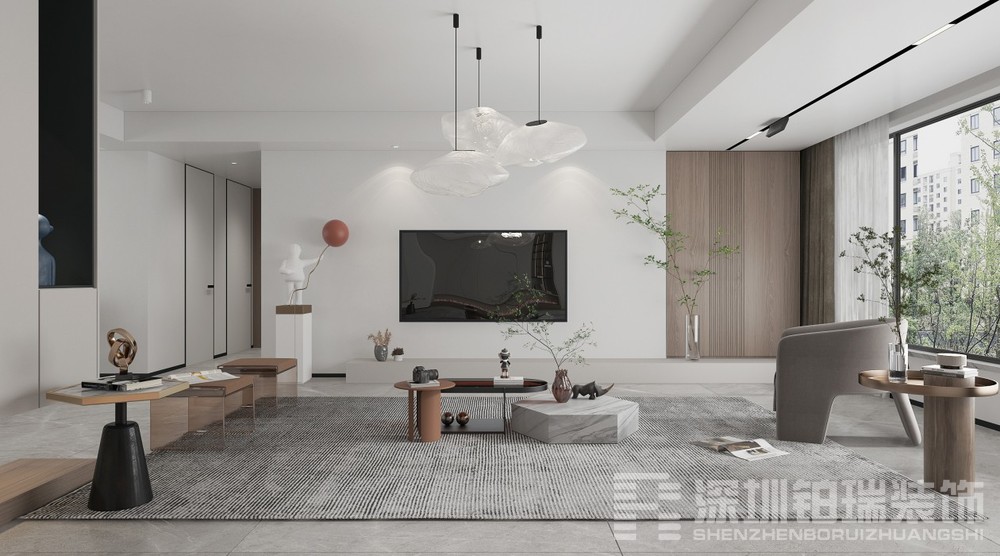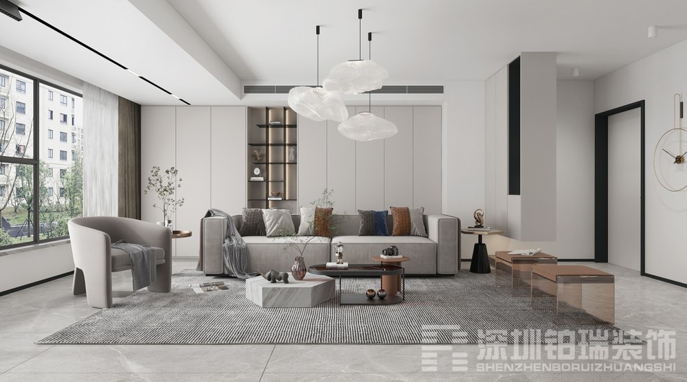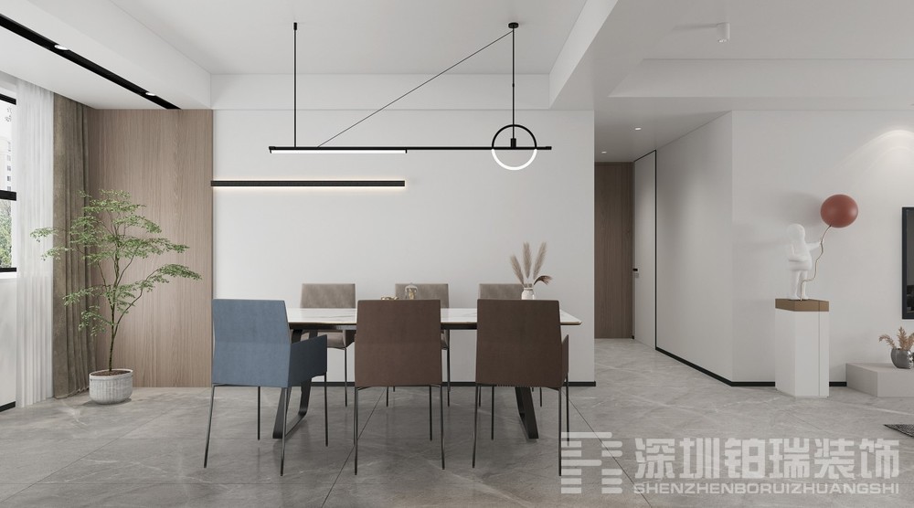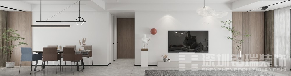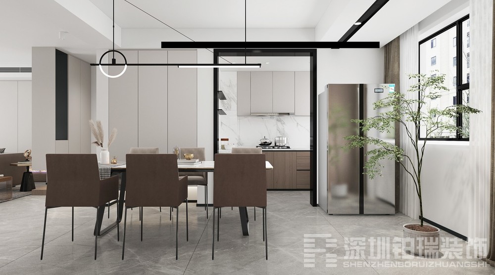设计说明:于白色的基调中,黑色与灰色作为点缀色,让空间统一又富有变化。加上无主灯的设计,更加简约大气。客餐厅一体化的设计,黑色线条延伸整个顶面。