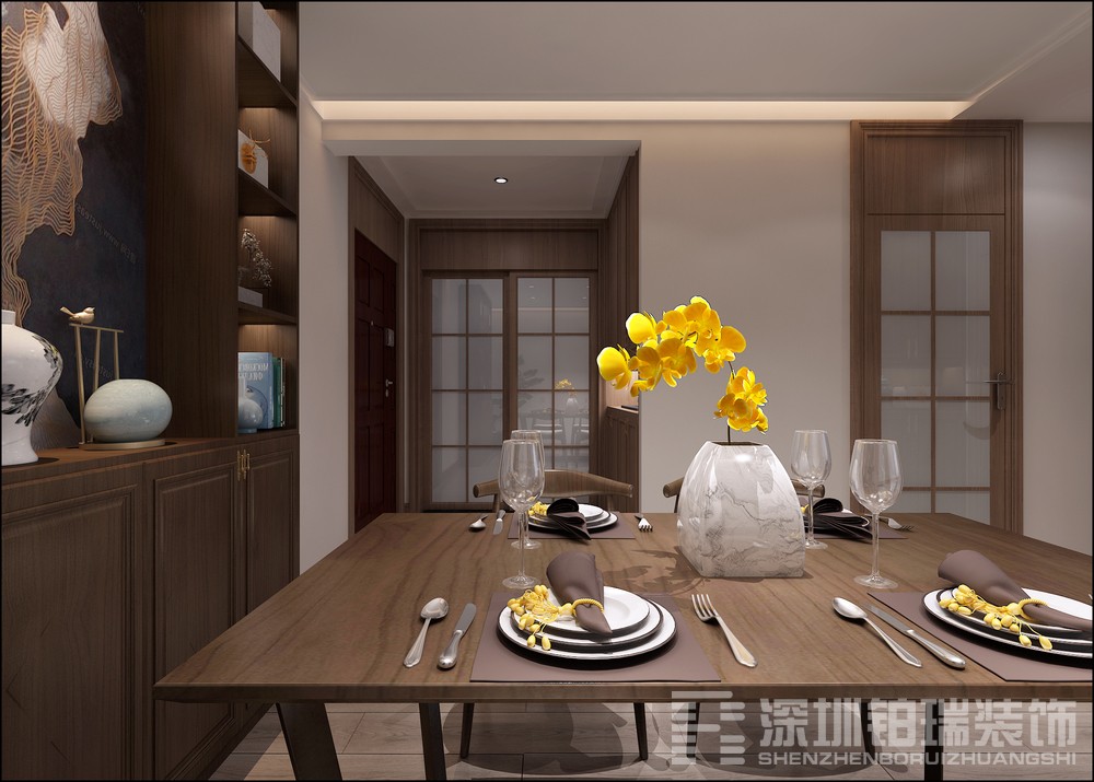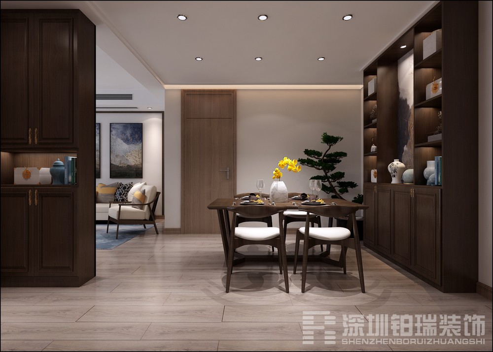 设计说明:简洁的空间中,没有繁杂和冗余的造型与结构,直线感的空间给予中式艺术更多表达的余地,创新出与众不同的清雅,让人感受到素色安谧。在整个空间及软装设计上遵循中式文化的精髓,从而突出清新淡雅、内敛含蓄,亦张亦弛中让你品鉴东方美学底蕴。