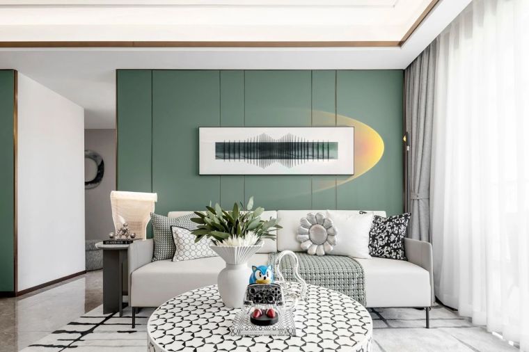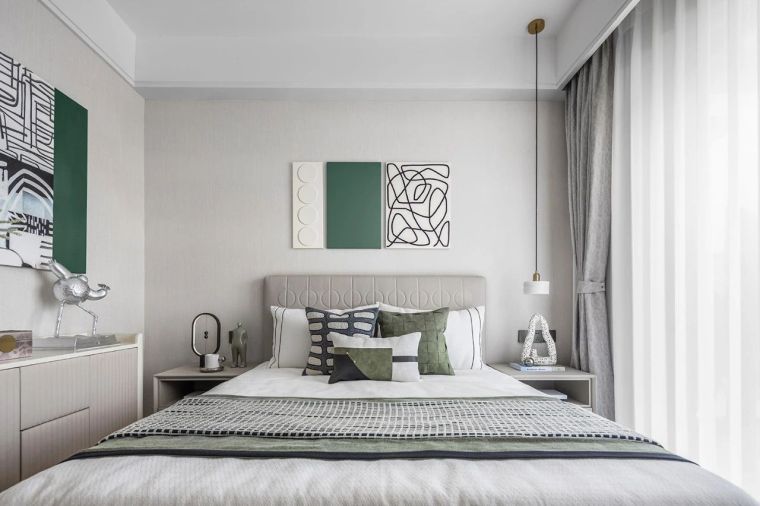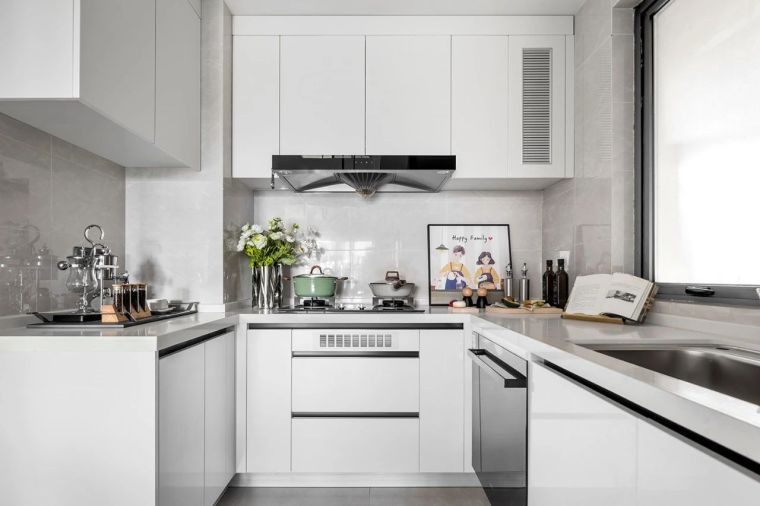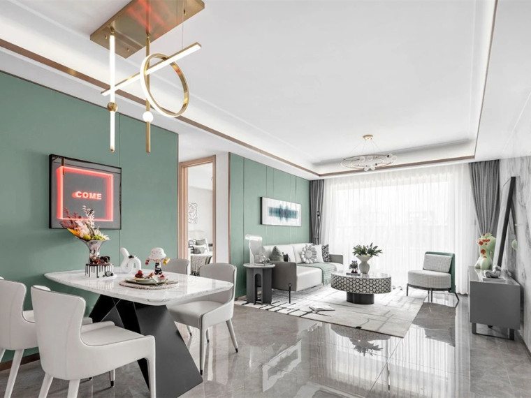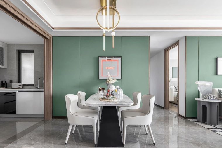 设计理念:设计创造了大横厅通透的视野条件,使空间不再具有固定、僵硬的界定,而是柔和相融。莫兰迪的绿豆灰色彩贯穿家中所有的场景,让整个空间充满轻松、潮酷而不乏温馨的感受。整个体验空间以“无定义、无边界”为理念,借此唤醒生活的质感、坚持独立思考的生活价值观及自由精神。厨房中U形岛式的台面将空间利用到极致,采用纯白色系的布置,使烹饪的空间整洁而轻快。