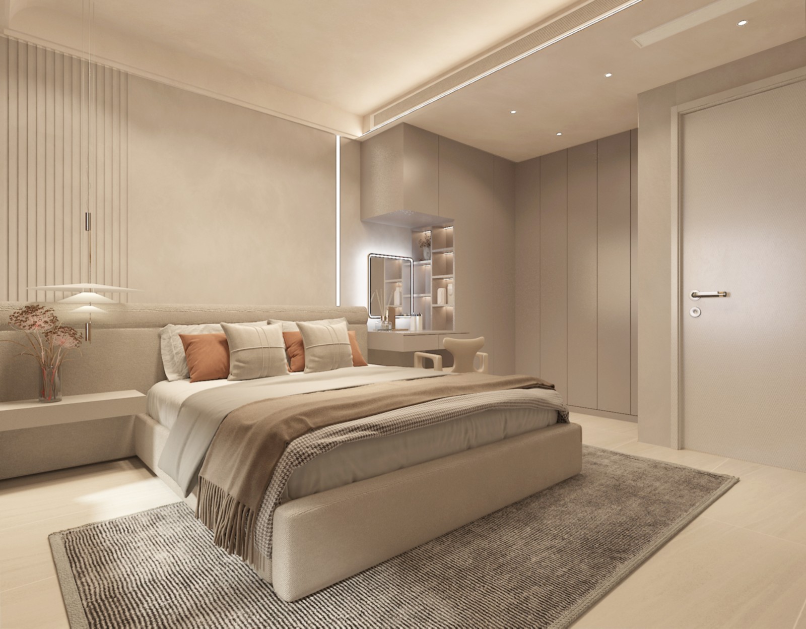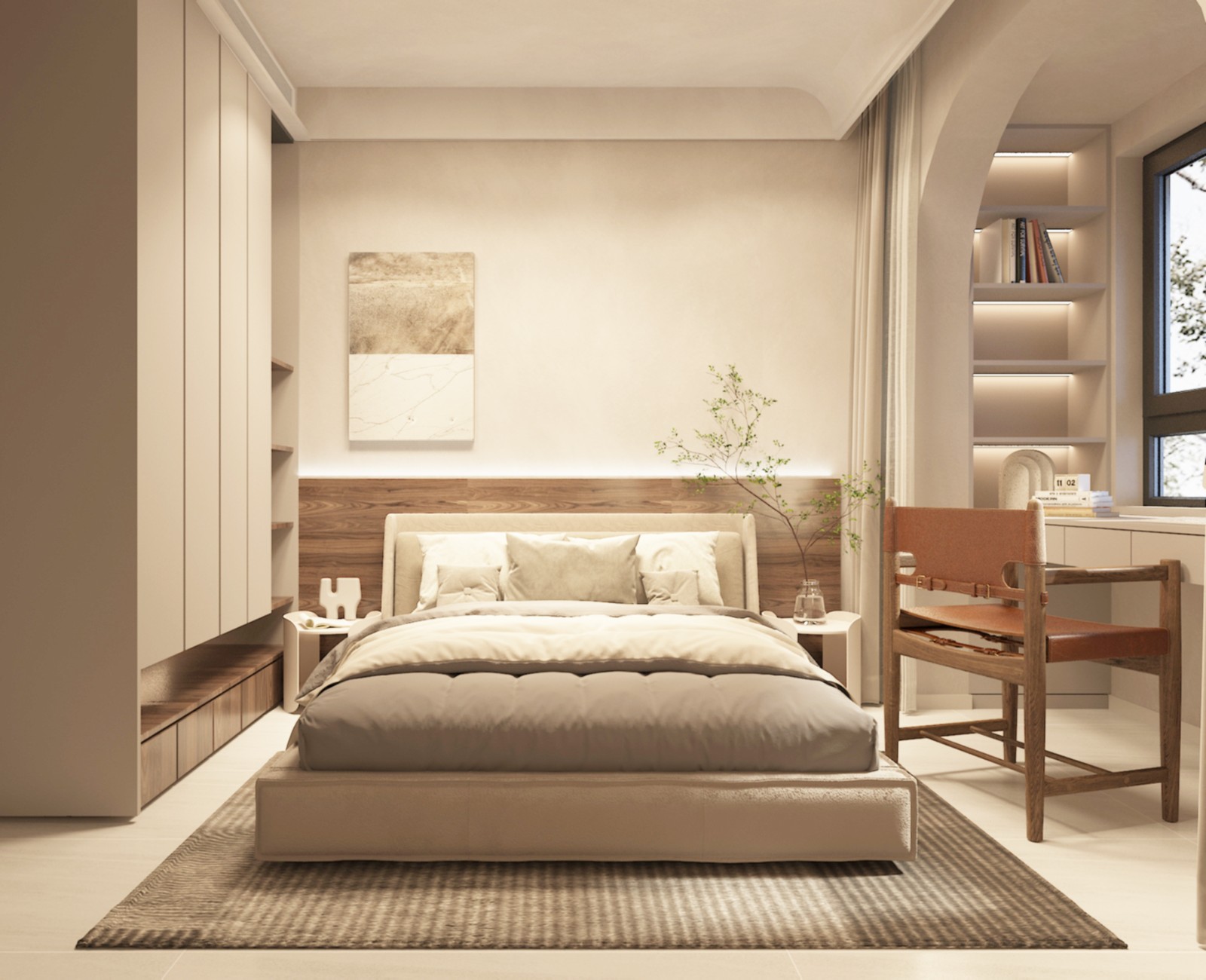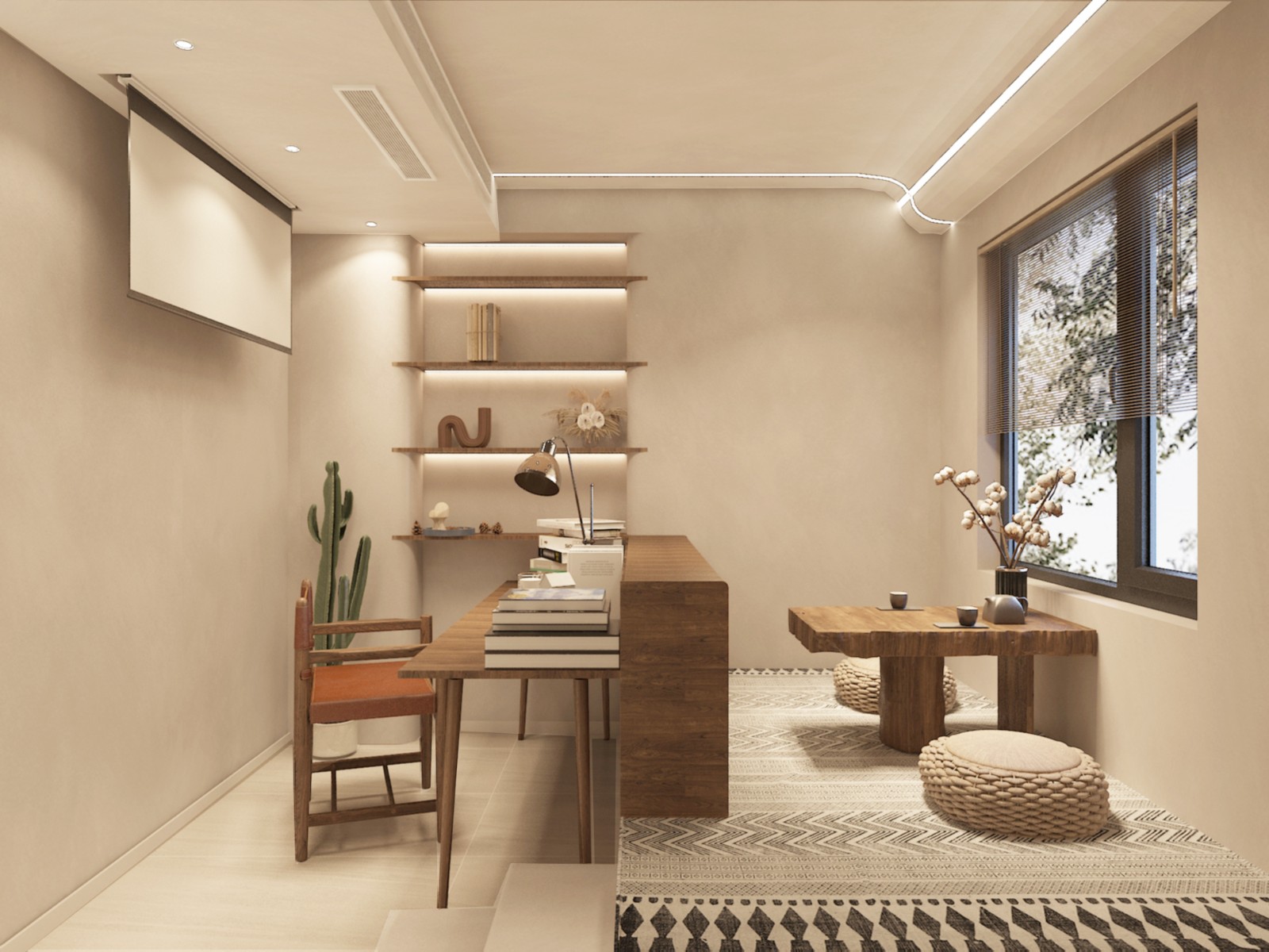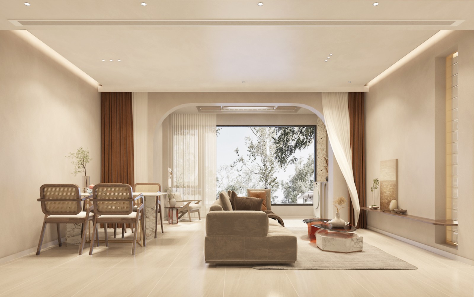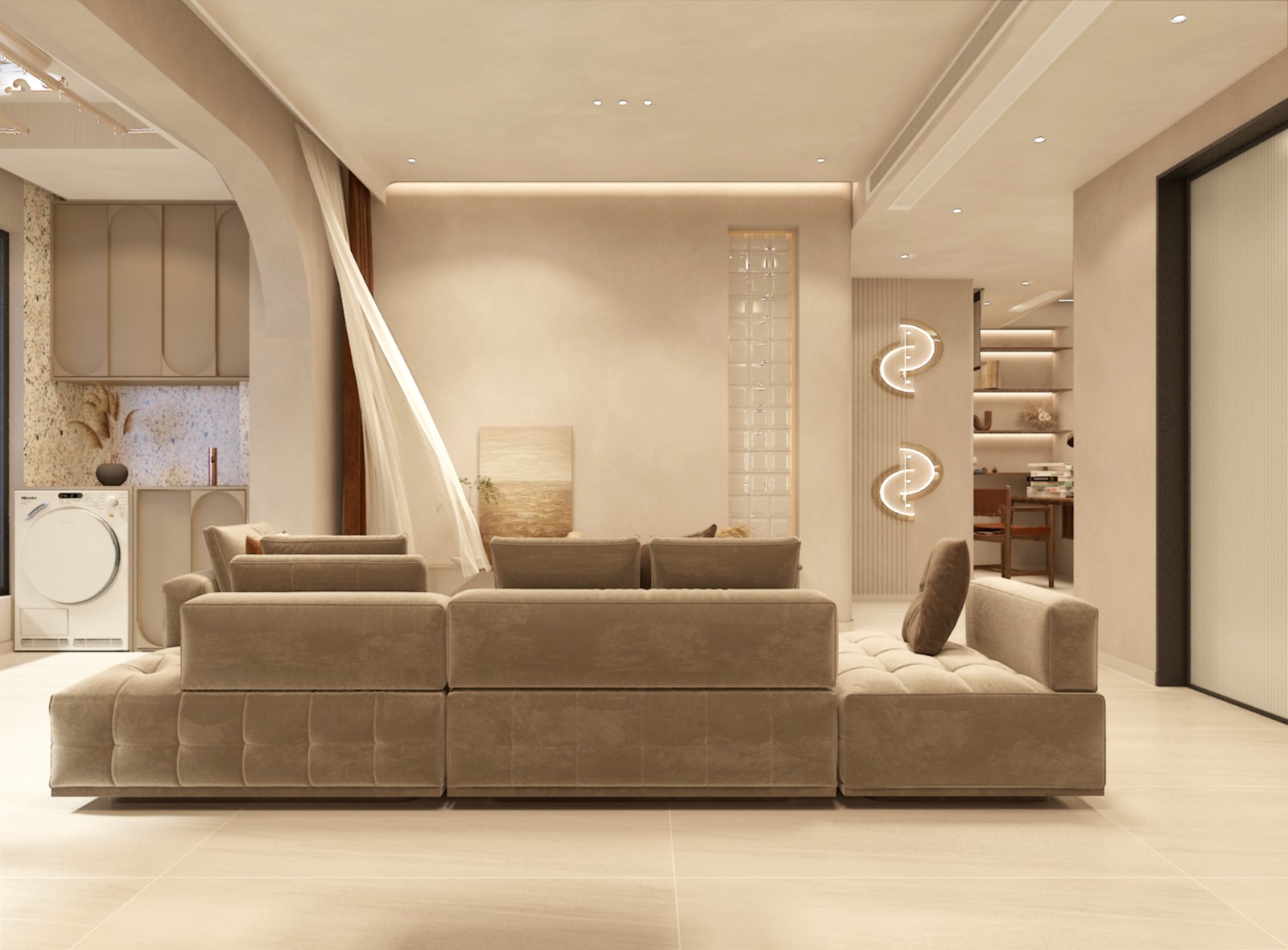 设计说明:现代生活的信息爆炸,物欲横流。大环境下人们压力倍增,容易焦虑,疲惫。流行的装饰风格在一定程度上折射着当下人们心境上的需求。也是在这样的情况下,和本方案的业主交谈中捕捉到这样的信息,给新婚夫妻两人推荐做诧寂风,很感谢他们的接受和喜欢。在设计中我们主要运用弧形的元素,打破原户型中空间相对局促,直线条多而刚硬的氛围。先让空间柔下来。拆掉多余墙体,让书房和客餐厅做联动,同时不要电视,在电视墙上做玻璃砖装饰,家中通透开敞,降低娱乐性让生活慢下来。整体用暖色调,兼具明度,无主灯顶面和局部立体光源的丰富,在主要材质微水泥和柔光砖的空间中柔和非常,让我们平静下来。方案设计感十足的同时当然也不会忽略房屋的主体,功能性。具有现代极简的轻省又有东方禅意幽静的诧寂,成全我们在生存工作的压力之余,回归生活本身,回归自己!