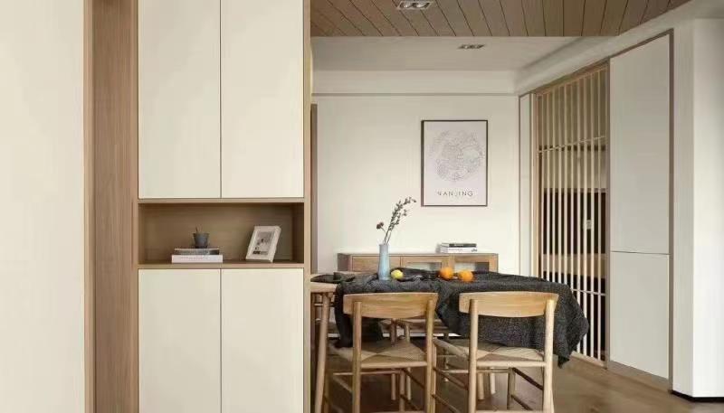 设计说明:客厅、餐、厨以开放动线作布局,大量的线板不仅为实墙造型,部分更作为柜体门片,把收纳藏入了虚实之间。空间中的墙面腰线巧妙的取自厨具内凹把手高度,让所有场域的横线一致性的延伸,设计师也去除了空间中绝大多数的柜体把手,以内凹式把手取代,或是隐藏于线板造型中,让柜面保持在简单的状态,为的就是维持空间中纯净的视觉。